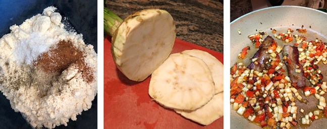 2. Add the bacon, celery root, and red pepper to the pan, and cook until vegetables are softened and bacon is done.