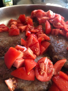 9. Once both sides of the beef are browned, add the chopped tomatoes and a bit of salt to bring out the tomatoes’ juices, and cook for 3-4 minutes, stirring gently.