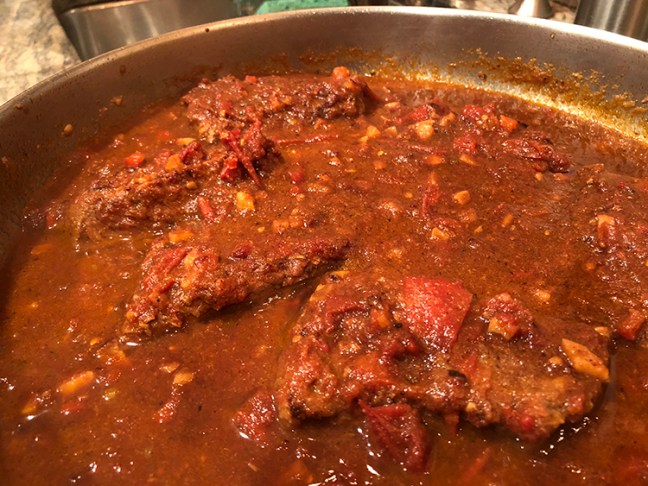 My favorite pan for this dish is my (very) old Farberware electric skillet, because it maintains a nice low simmer that develops flavor all day long. You could also make this in your slow cooker / crock-pot, or cook it on low heat in a dutch oven — after the initial pan-frying of the beef.