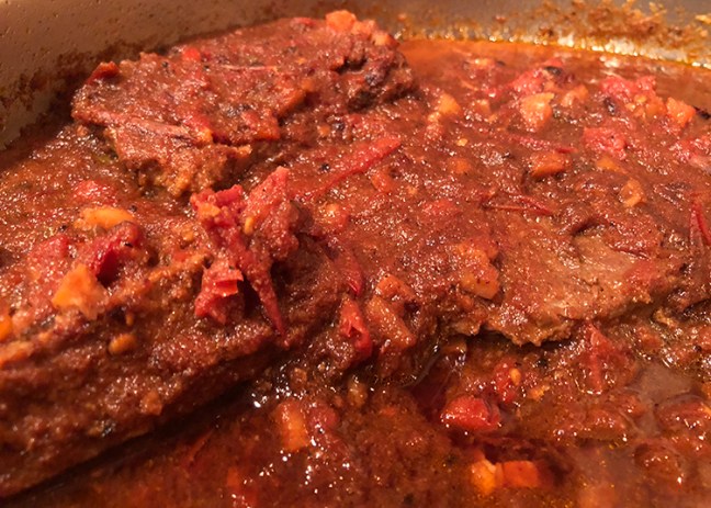 14. Regardless of how much longer you’re cooking the beef, keep an eye on the sauce and add more broth or water as needed. Over time, it will reduce and thicken, and if you’re really lucky, it will start to get bit dry and brown under the meat. Why lucky? That brown stuff is packed with flavor! Just add more broth or water, stir it well to scrape up the brown bits, and this will add a lovely dark brown color and caramelized flavor to your sauce.