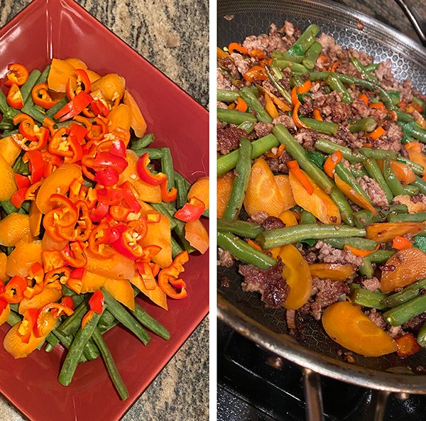 - Push meat / ginger mixture to the edges of the pan again, and add green beans, carrots, and red peppers. Stir kosher salt into veggies, cover wok or frying pan with a lid, and cook until the vegetables start to soften, about 3-4 minutes.