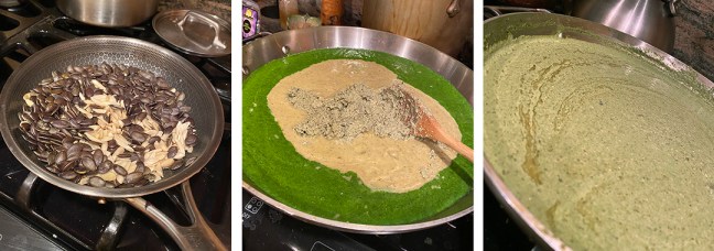 Place pepitas, almonds, sesame seeds, and remaining reserved cooking liquid into the blender and process until mixture forms a loose, coarse paste, 25 to 35 seconds.